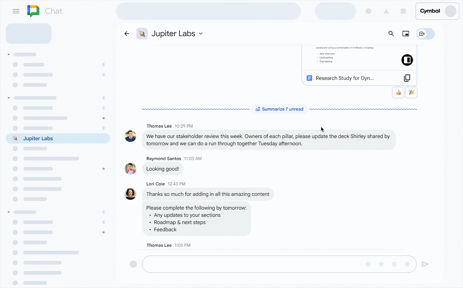 Gemini ช่วยสรุปบทสนทนาและไฟล์ที่แชร์ภายใน Chat ล่าสุดได้เพิ่มความสามารถในการติดตามข้อความที่ยังไม่ได้อ่าน ทั้งในการสนทนาส่วนตัว กลุ่ม และพื้นที่ทำงาน