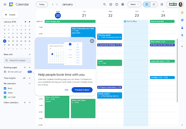Google Calendar เพิ่มหน้า Booking Page ที่ตั้งค่าไว้ล่วงหน้าและเข้าถึงได้จากแถบด้านข้าง ผู้ใช้ที่ยังไม่ได้สร้างตารางนัดหมายจะได้รับหน้า Booking Page ที่พร้อมใช้งานทันที ทำให้ผู้อื่นสามารถจองเวลานัดหมายได้อย่างสะดวก