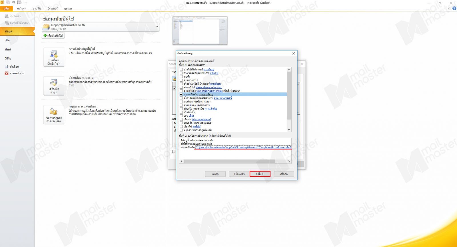 11. ไฟล์ที่ถูกเลือกจะมาอยู่ที่หน้า ตัวช่วยสร้างกฎ ในช่องขั้นที่ 2 จากนั้นกด “ถัดไป”