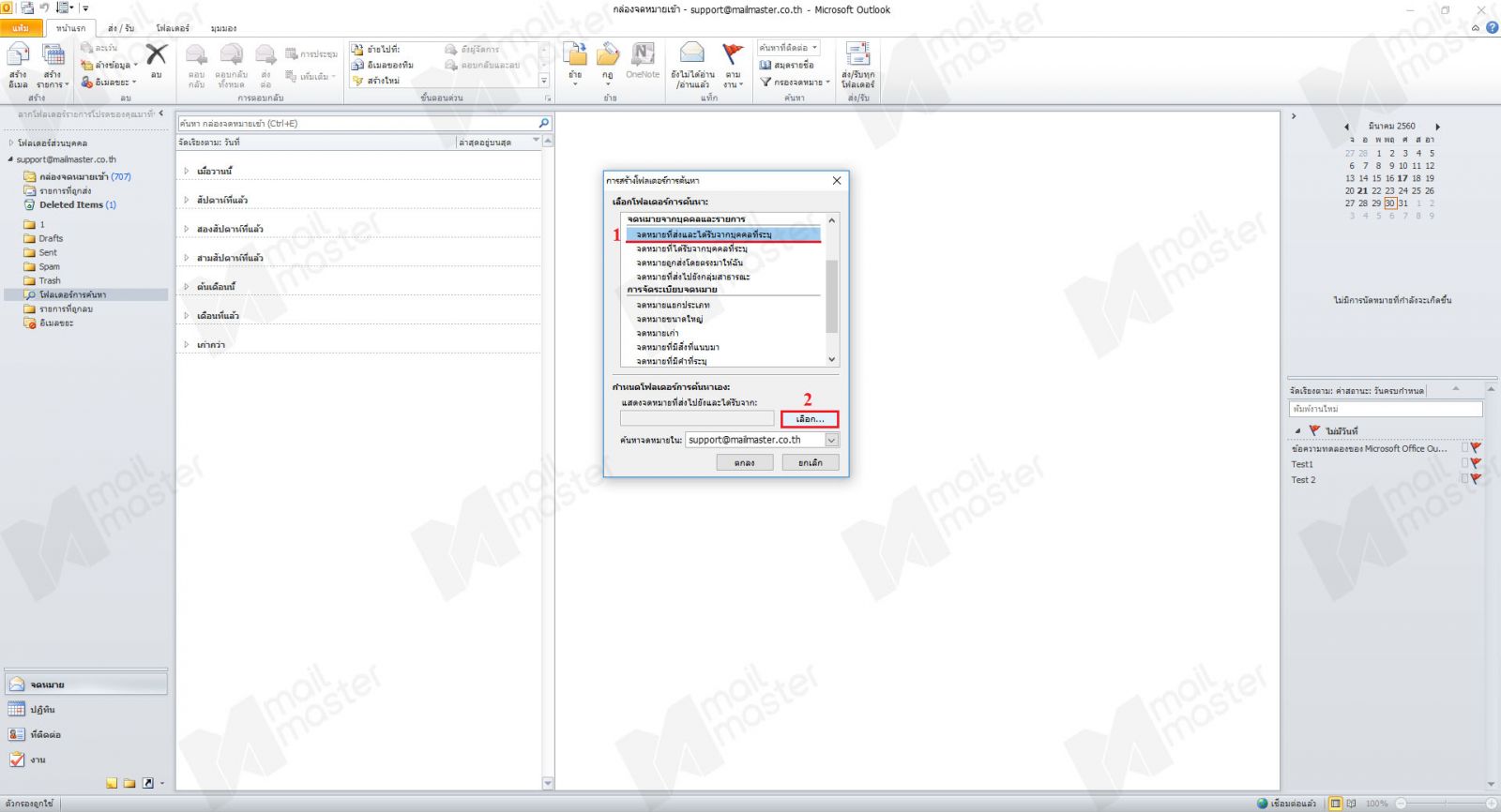 4. จะกลับมาที่หน้า การสร้างโฟลเดอร์การค้นหา รายชื่อที่ถูกเลือกจะมาอยู่ที่ช่อง แสดงจดหมายที่ส่งไปยังและได้รับจาก: จากนั้นให้กด “ตกลง”
