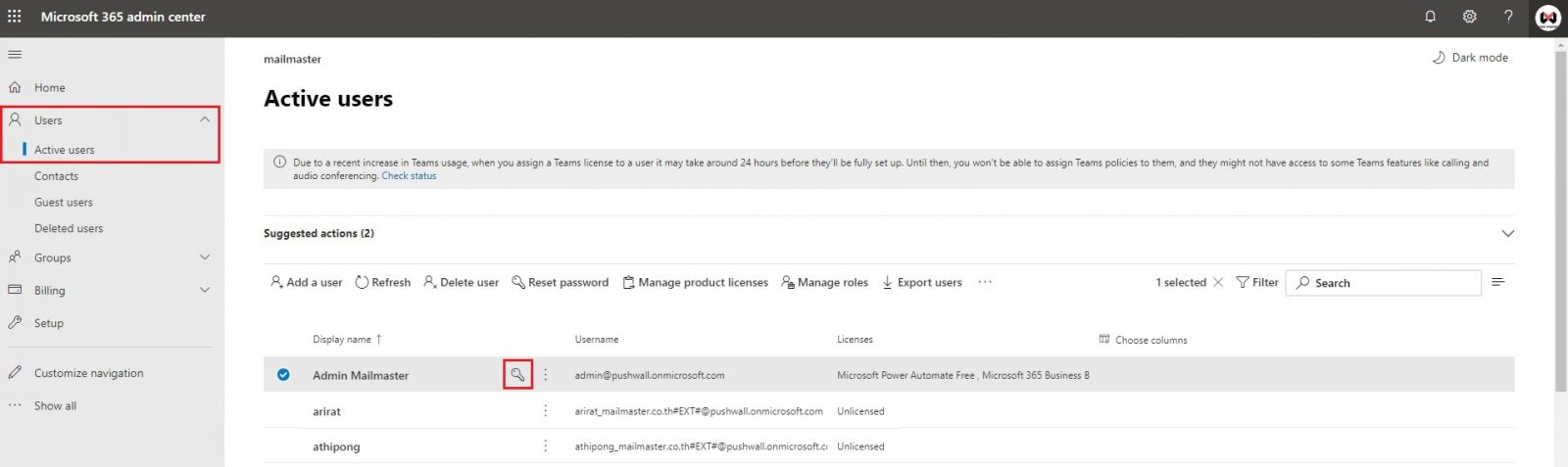 2. เลือก User ที่ต้องการเปลี่ยนรหัสผ่าน จากนั้นให้คลิกรูปกุญแจ(ตามภาพ)