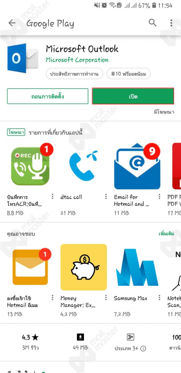 1. Download App "Microsoft Outlook" เสร็จแล้วกด "เปิด" แอพ